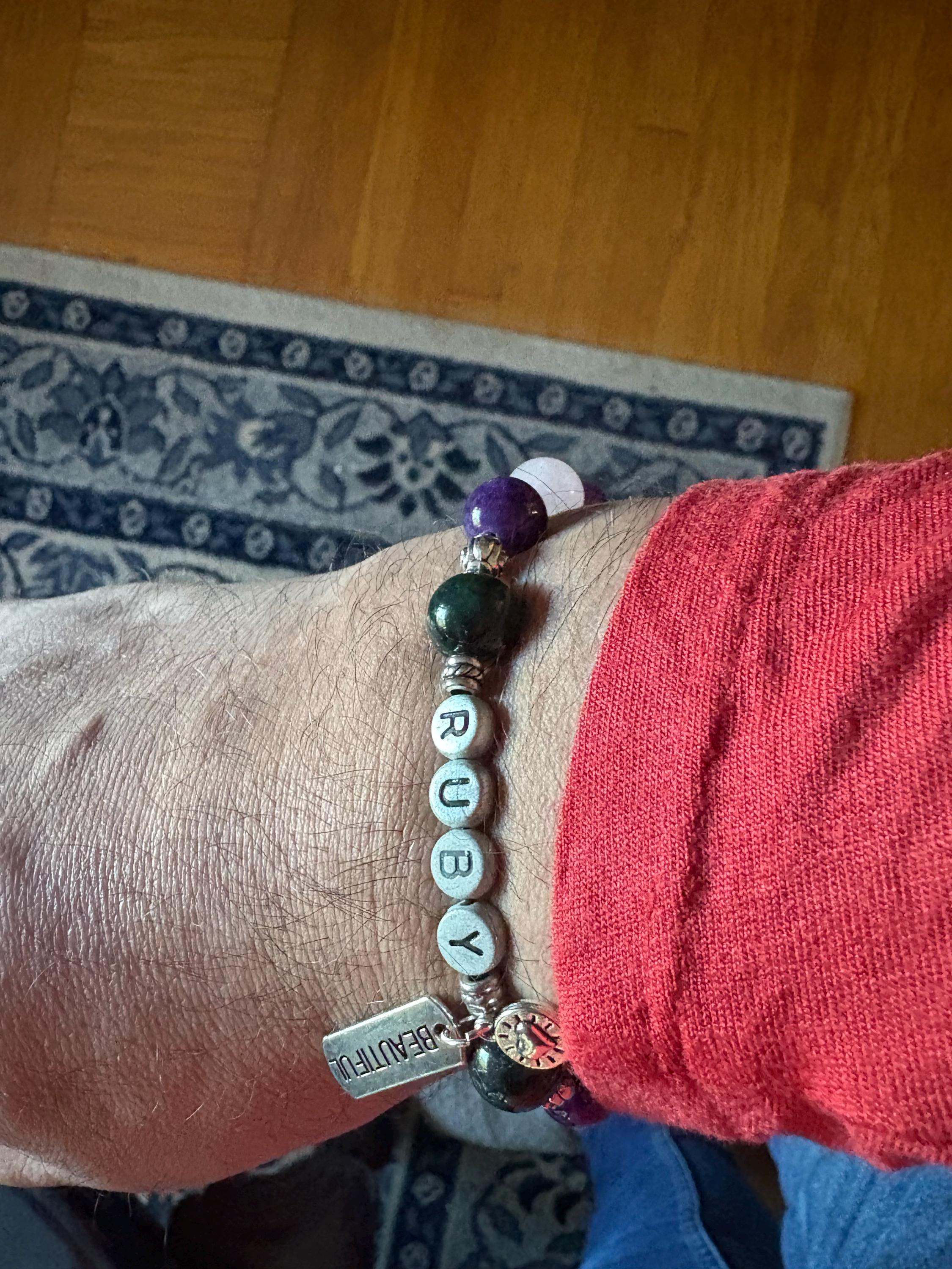 "BEAUTIFUL" is made with 10mm Rose Quartz Beads, 10mm Amethyst Beads, 10mm Blue Apatite Beads, 10mm Green Agate. Silver Plated Rosebud Spacers, Silver Plated Tag and Charms and Strong, High Quality, 1mm Stretch Cord.
